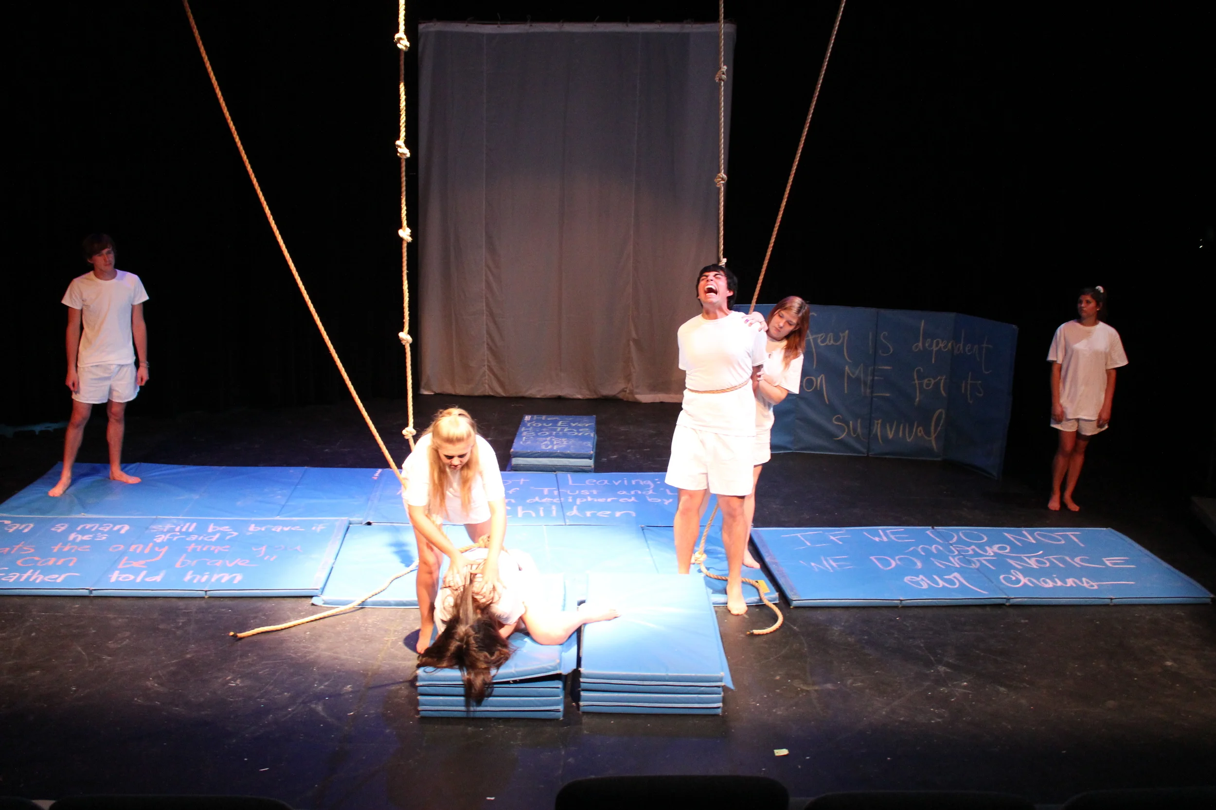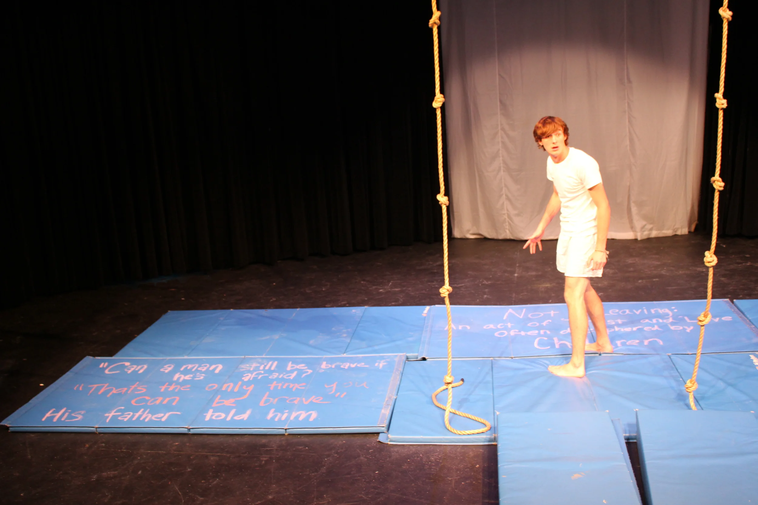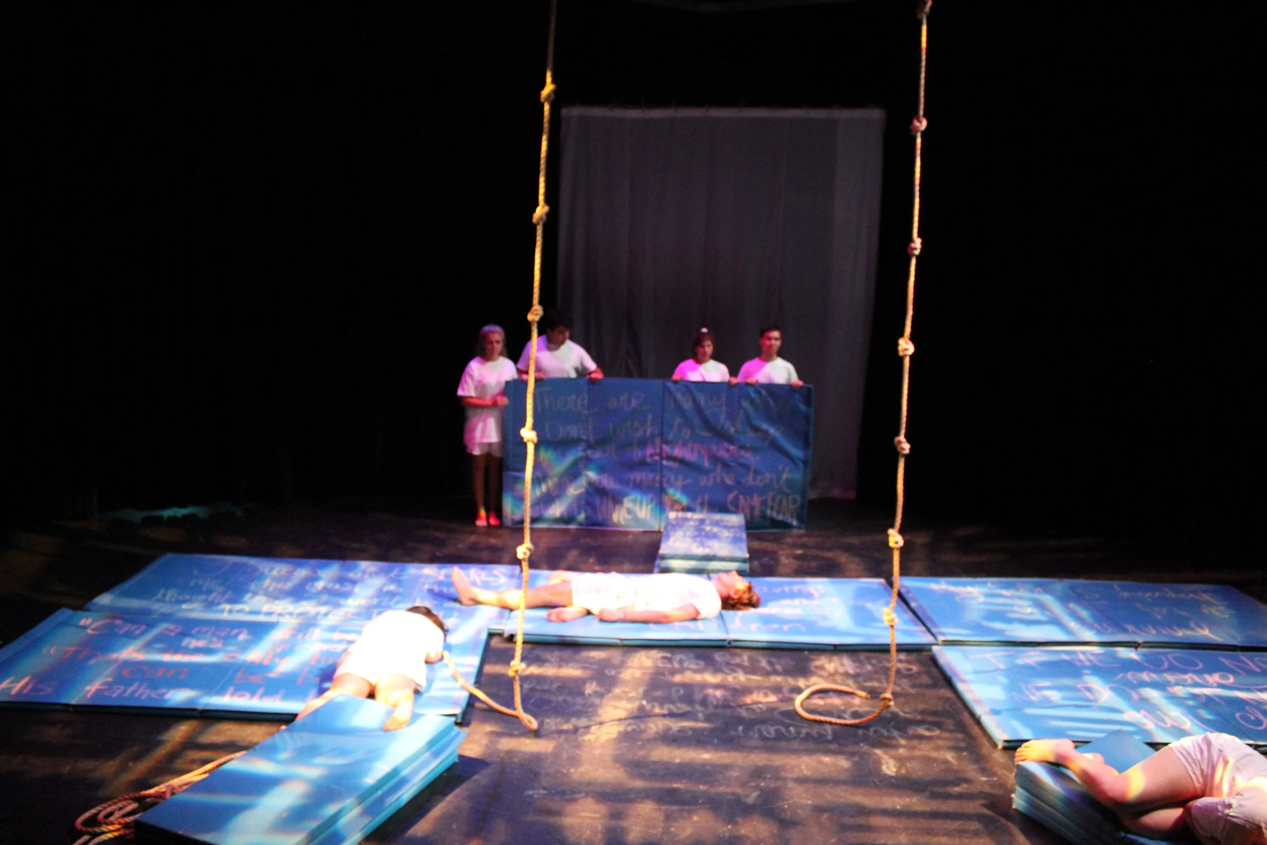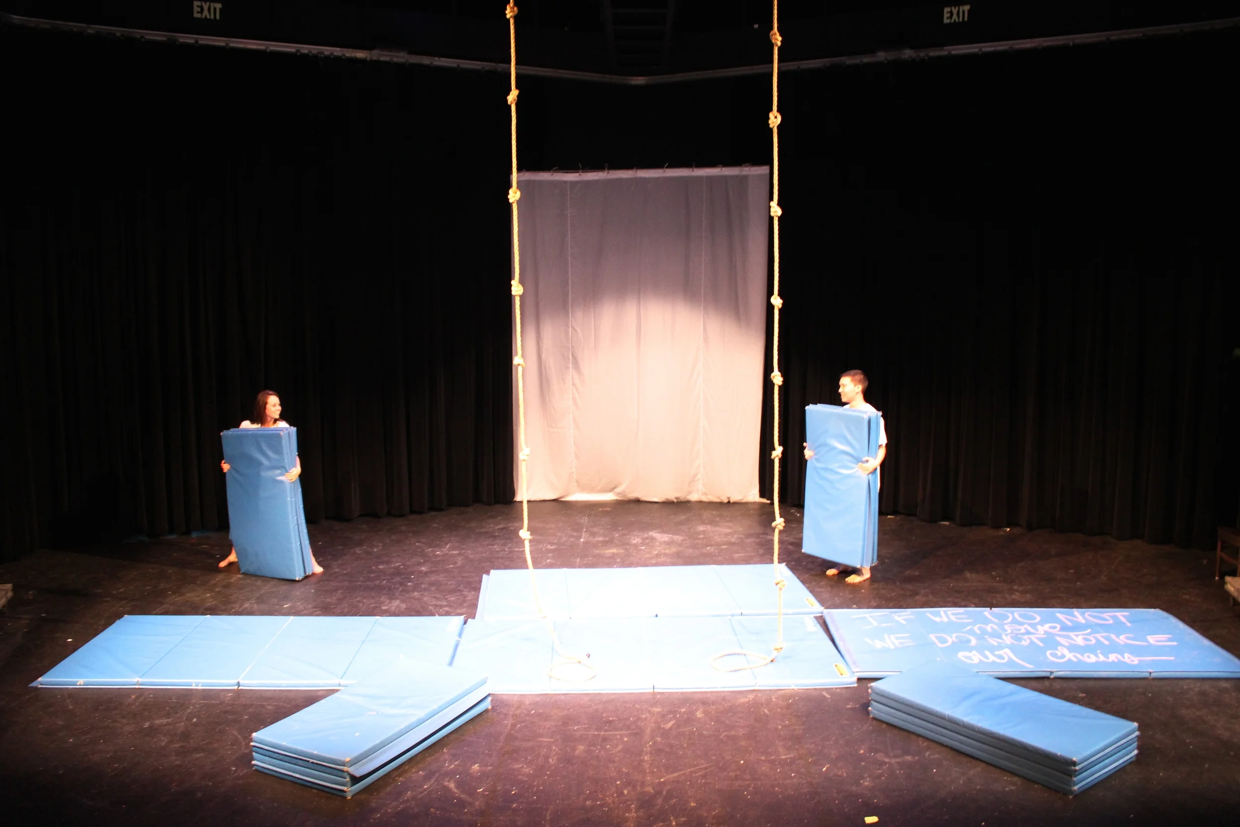 I think that my scene was a success on performance day, September twenty-sixth, for a number of reasons. The first of those reasons being that my scene was different than the three that were performed prior to mine. I anchored my scene around a simple construction of mats, chalk and ropes, then came up with ways to use them to add depth to what the actors were doing on stage. Another reason I thought my scene was successful was that I did not try to make any part of it pointed. I formed a very personal scene that meant what I wanted it to to myself, while still leaving it open to each audience members interpretation. I did not use any noticeable historical events, which I think helped to achieve this goal. While talking with different audience members after the performance, many pointed out things that resonated with them that I had never even thought of. The third reason I believe my scene was a success was that I let my actors tell the story. I admit that I started off trying to give them characters for each scene, but found out rather quickly that trying to do that for this scene was a mistake. All I had to do was block the sequences and my extremely diverse group of actors brought what was needed to portray the scene I was trying to create.