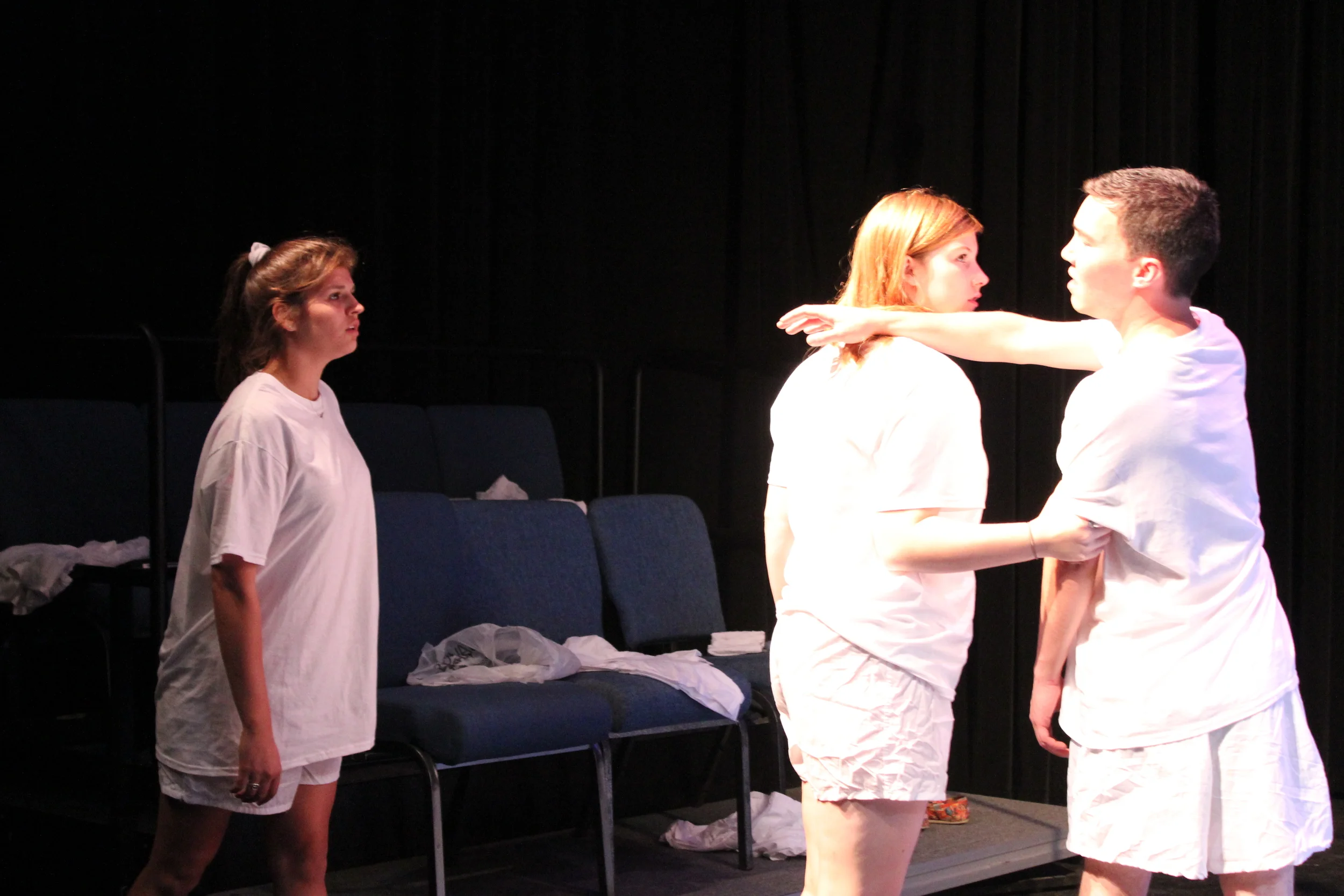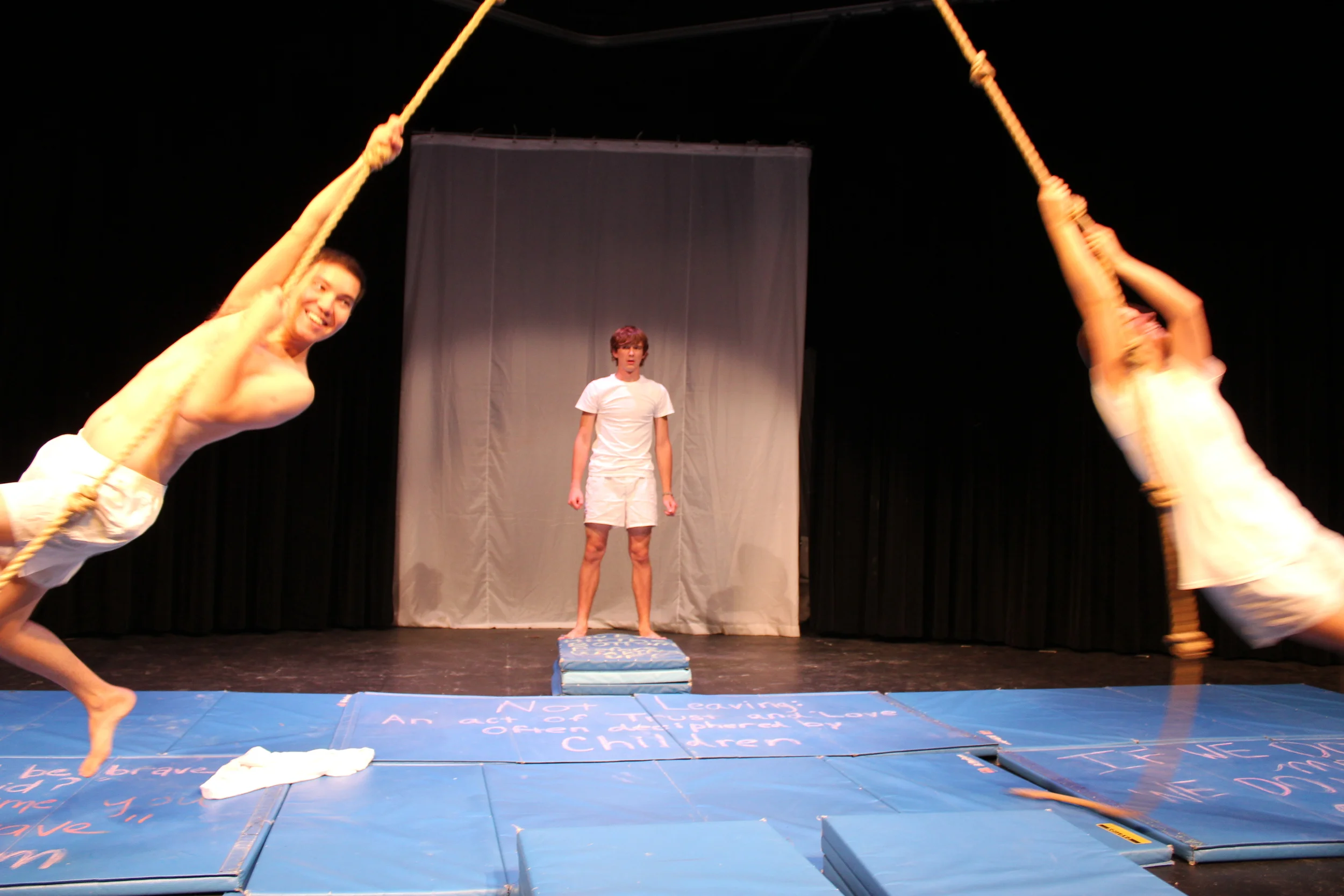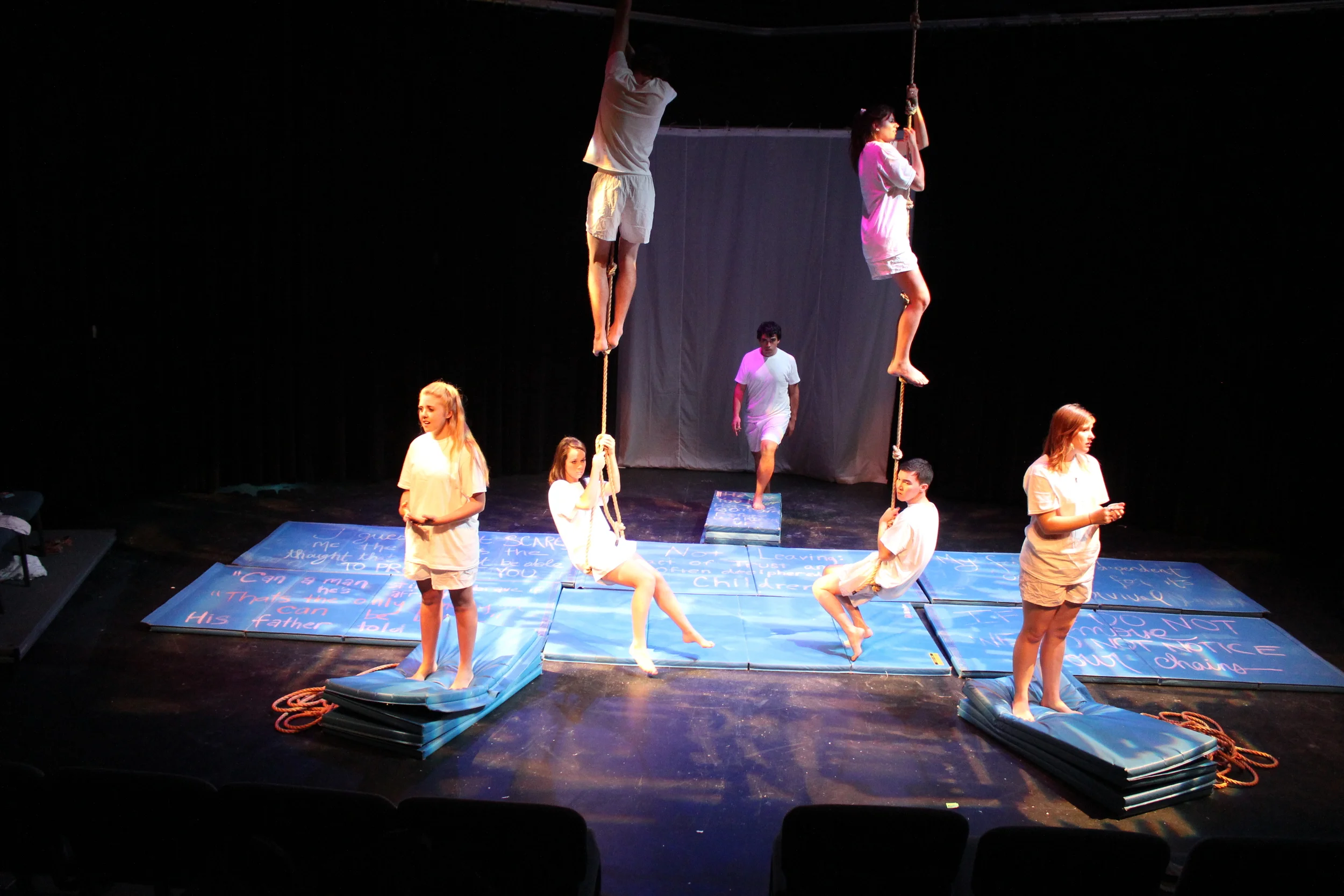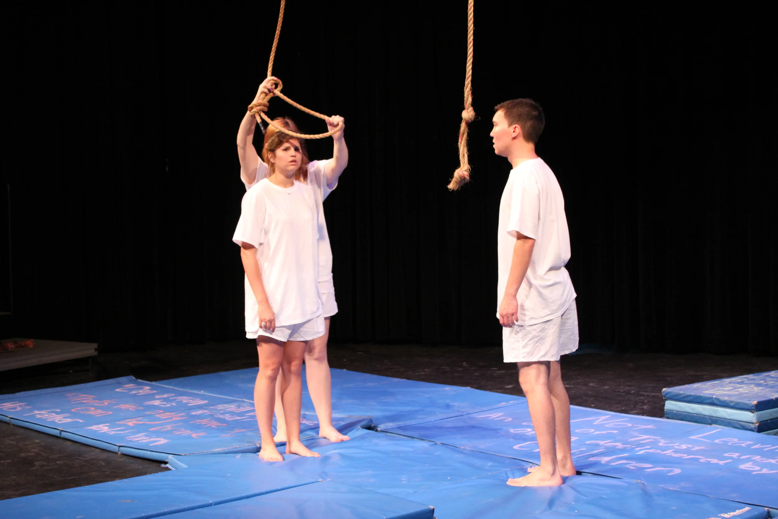 I think that my scene was a success on performance day, September twenty-sixth, for a number of reasons. The first of those reasons being that my scene was different than the three that were performed prior to mine. I anchored my scene around a simple construction of mats, chalk and ropes, then came up with ways to use them to add depth to what the actors were doing on stage. Another reason I thought my scene was successful was that I did not try to make any part of it pointed. I formed a very personal scene that meant what I wanted it to to myself, while still leaving it open to each audience members interpretation. I did not use any noticeable historical events, which I think helped to achieve this goal. While talking with different audience members after the performance, many pointed out things that resonated with them that I had never even thought of. The third reason I believe my scene was a success was that I let my actors tell the story. I admit that I started off trying to give them characters for each scene, but found out rather quickly that trying to do that for this scene was a mistake. All I had to do was block the sequences and my extremely diverse group of actors brought what was needed to portray the scene I was trying to create.
