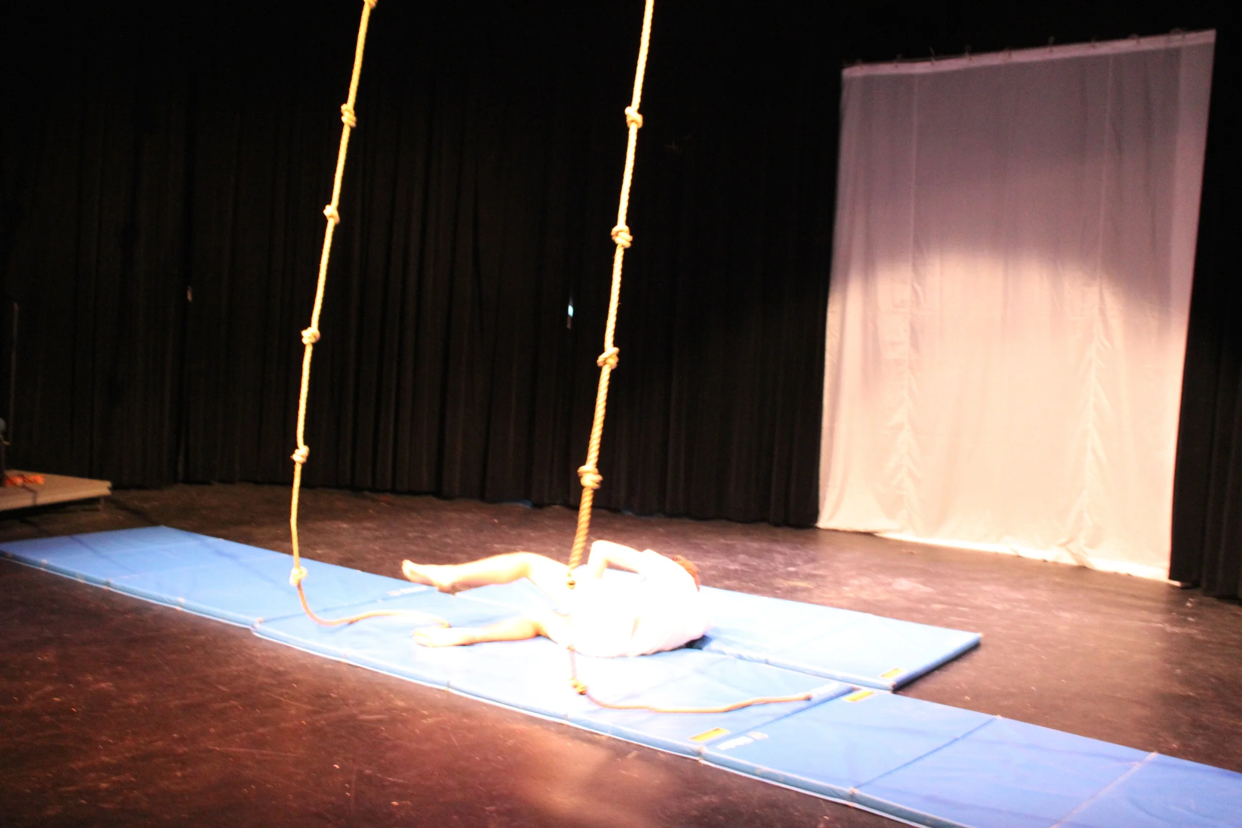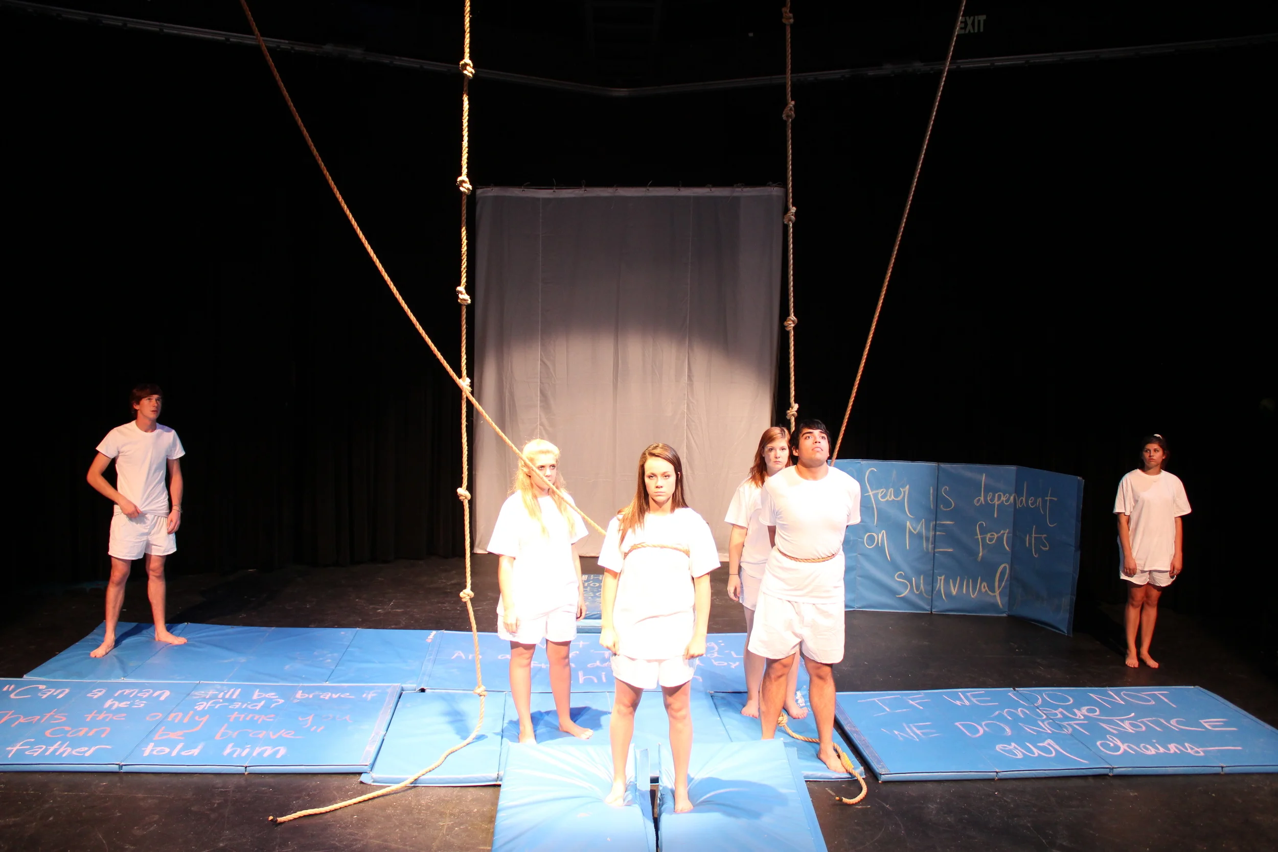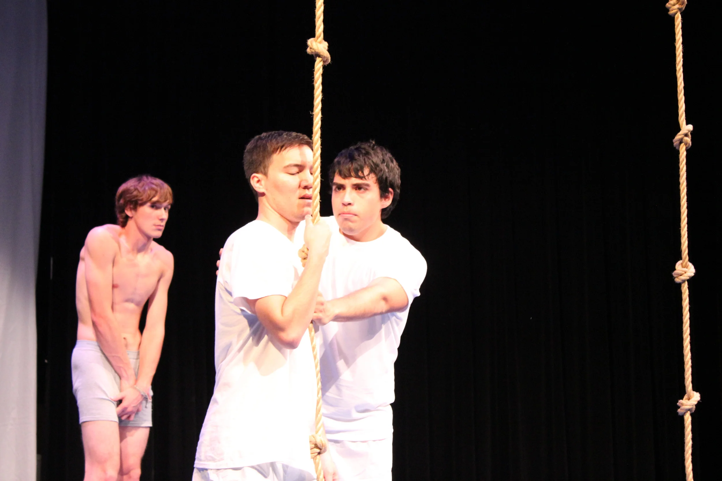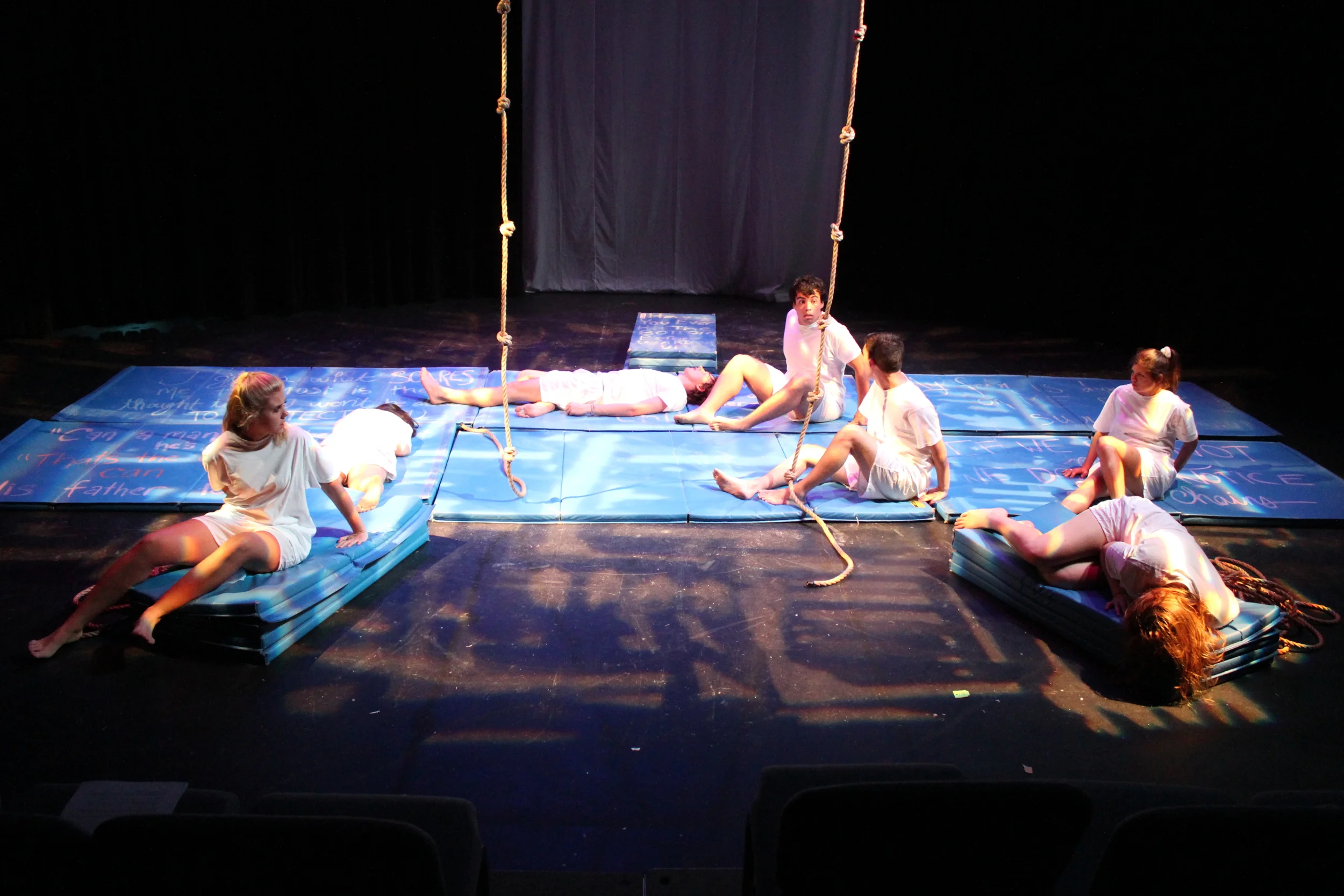 I think that my scene was a success on performance day, September twenty-sixth, for a number of reasons. The first of those reasons being that my scene was different than the three that were performed prior to mine. I anchored my scene around a simple construction of mats, chalk and ropes, then came up with ways to use them to add depth to what the actors were doing on stage. Another reason I thought my scene was successful was that I did not try to make any part of it pointed. I formed a very personal scene that meant what I wanted it to to myself, while still leaving it open to each audience members interpretation. I did not use any noticeable historical events, which I think helped to achieve this goal. While talking with different audience members after the performance, many pointed out things that resonated with them that I had never even thought of. The third reason I believe my scene was a success was that I let my actors tell the story. I admit that I started off trying to give them characters for each scene, but found out rather quickly that trying to do that for this scene was a mistake. All I had to do was block the sequences and my extremely diverse group of actors brought what was needed to portray the scene I was trying to create.